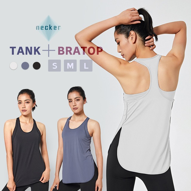 ブラなし1枚で着られるタンクトップが一体型になったレディース ヨガウェア。ブラトップはノンワイヤーで、締め付けずにしっかりと胸をホールド。腕を動かしてもズレることがなく安定したポジションをキープしてくれます。 おへその下まできちんと隠れる長めのトップスで、体型カバーしてくれます。伸びをしたり前かがみになる姿勢でもお腹まわりの肌の露出が気になりません。 素材 :ポリエステル 80%, スパンデックス 20% サイズ:S, M, L カラー:ライトグレー, ネイビー, ブラック